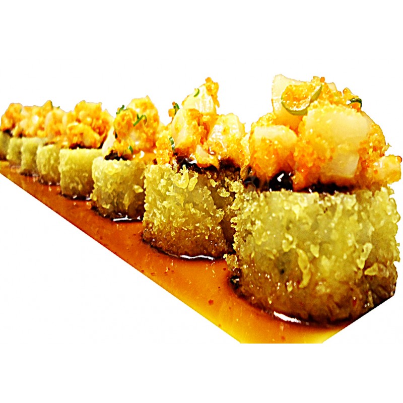 crab meat, asparagus, cream cheese deep fried topped with spicy scallop, crunchy & green onion
