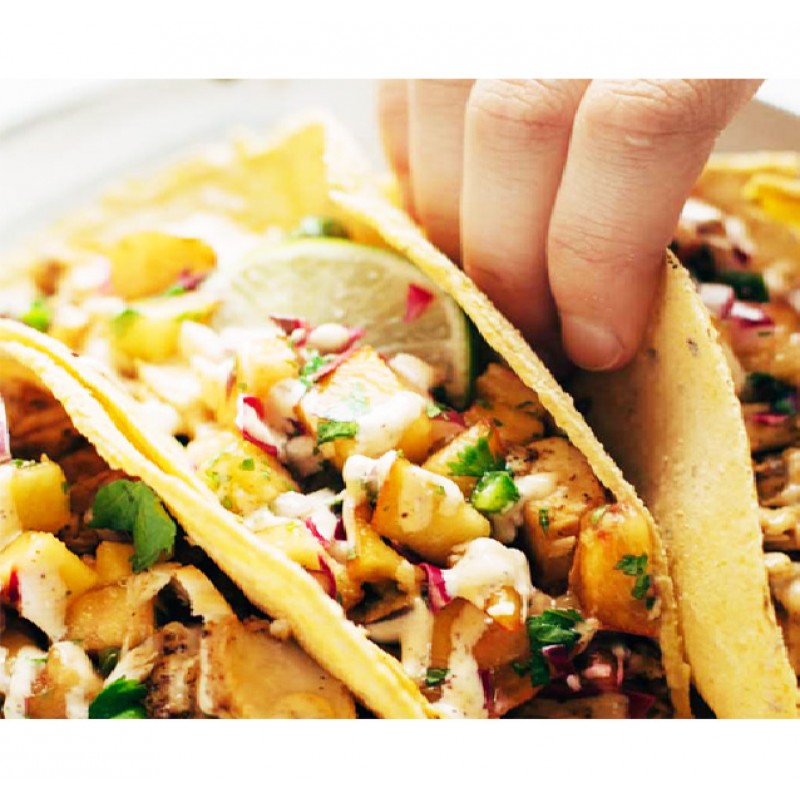 fried shrimp, crab salad, and mango with soft taco