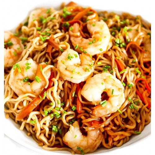 stir fried lo mein with shrimp, napa cabbage, carrot