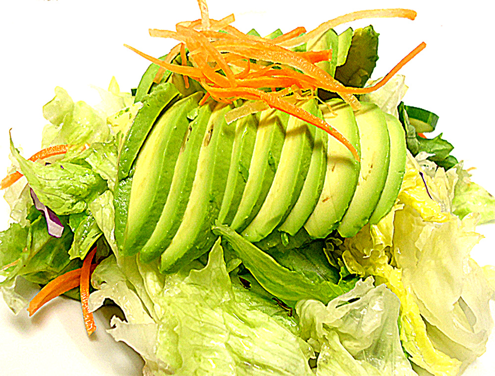 house salad with thin sliced avocado & cucumber served with homemade ginger dressing