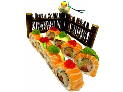 spicy tuna, avocado rolled topped with 2 pieces tuna, 2 pieces salmon, 2 pieces shrimp..