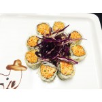 spicy crab salad, crunchy flake rolled with rice and seaweed