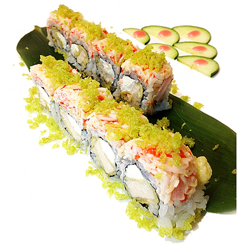 chicken tempura with cream cheese rolled topped with crab meat & crunchy flake.
