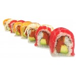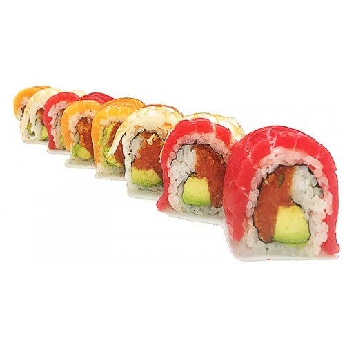 spicy tuna, avocado rolled topped with 2 pieces tuna, 2 pieces salmon, 2 pieces shrimp