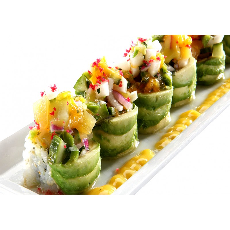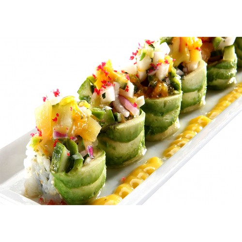 spicy tuna, cucumber & curnchy topped with avocado & mango salsa