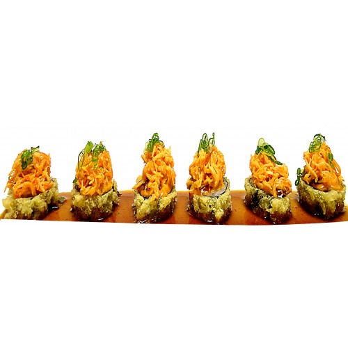 tuna, yellow tail, asparagus, cream cheese rolled and deep fried topped with