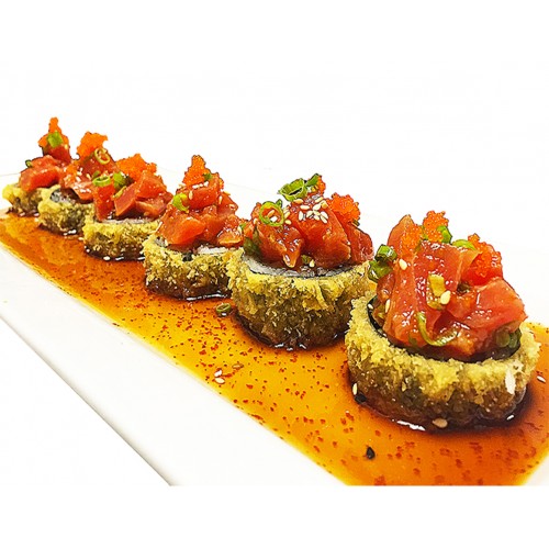 salmon, asparagus rolled and deep fried topped with spicy tuna, cavia &