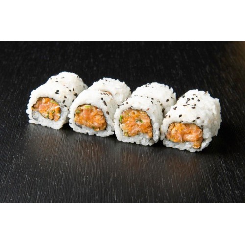 spicy salmon and crunchy flake rolled with rice and seaweed